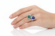 Anello Contrarie’realizzato in oro bianco 18 kt con zaffiro naturale blu taglio tondo per ct.4.20 e smeraldo taglio tondo per ct.3.92 e profilo in diamanti naturali bianchi taglio brillante per ct.1.00 colore GVVs