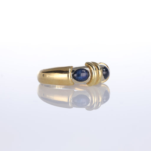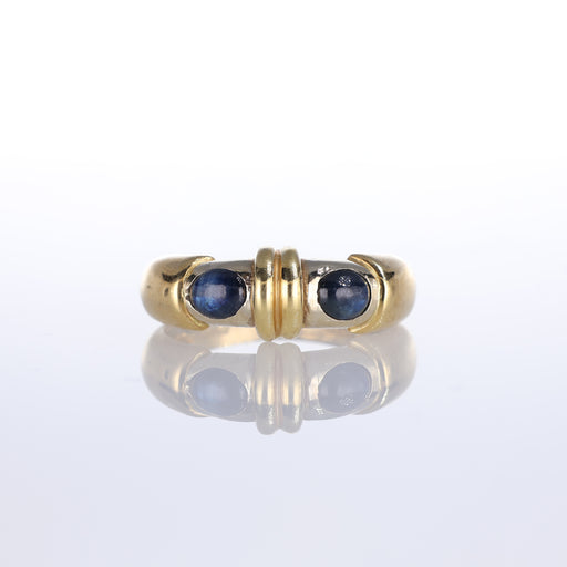 Un raffinato anello a fascia in oro giallo 18k con due zaffiri blu taglio cabochon. Il design minimalista ed elegante esalta il colore intenso e la...