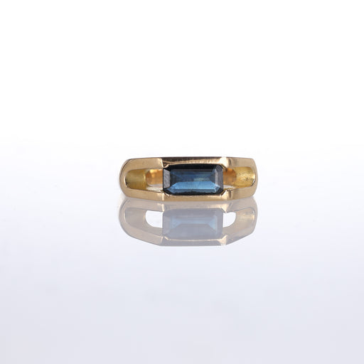 Mostra dettagli completiUn anello a fascia sofisticato realizzato in oro giallo 18kt, con uno zaffiro centrale taglio quadrato di 0,35 carati. Il design lineare e minimale...