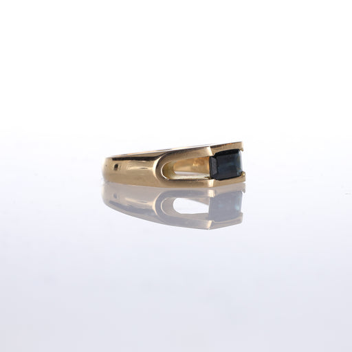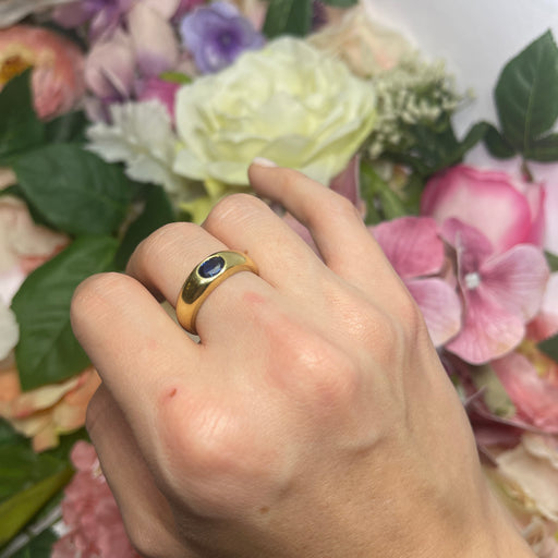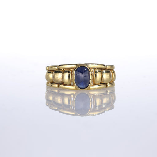 Mostra dettagli completiUn anello a fascia robusto e sofisticato in oro giallo 18kt, caratterizzato da uno zaffiro centrale taglio cabochon da 0,30 carati. Il design audac...