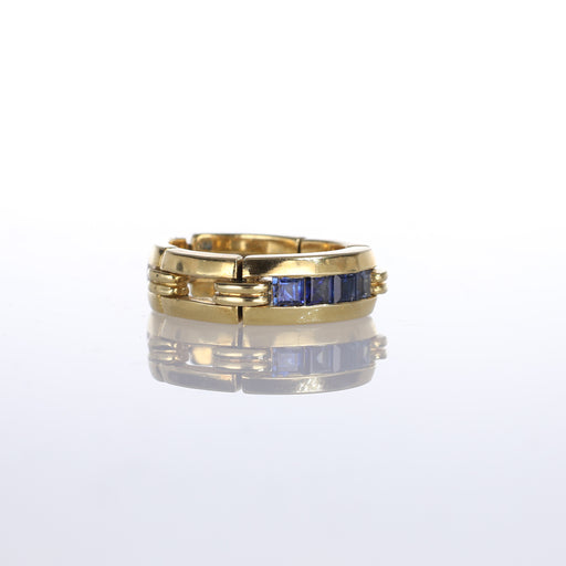 Mostra dettagli completiUn lussuoso anello a fascia in oro giallo 18kt con quattro zaffiri centrali taglio quadrato, per un totale di 0,70 carati. L’anello è realizzato co...