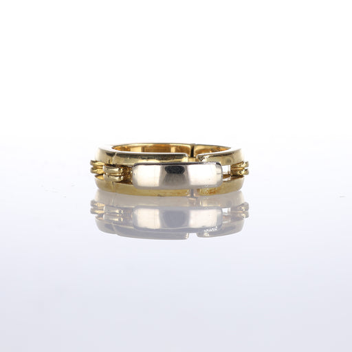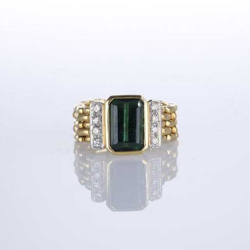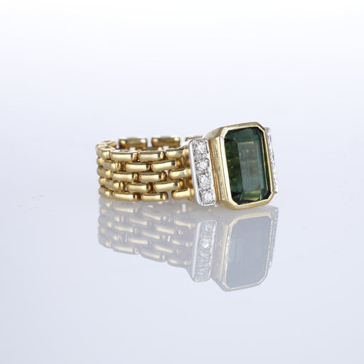 Mostra dettagli completiUn anello a fascia in oro giallo 18kt dal design audace con un motivo a catena in stile pantera. Al centro, una tormalina verde taglio smeraldo, af...