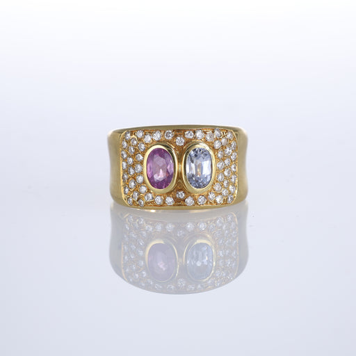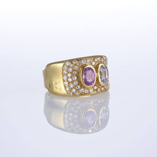 Mostra dettagli completiUn elegante anello a fascia in oro giallo 18kt, impreziosito da 52 diamanti naturali in pavé che incorniciano due splendide tormaline ovali nelle t...