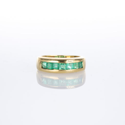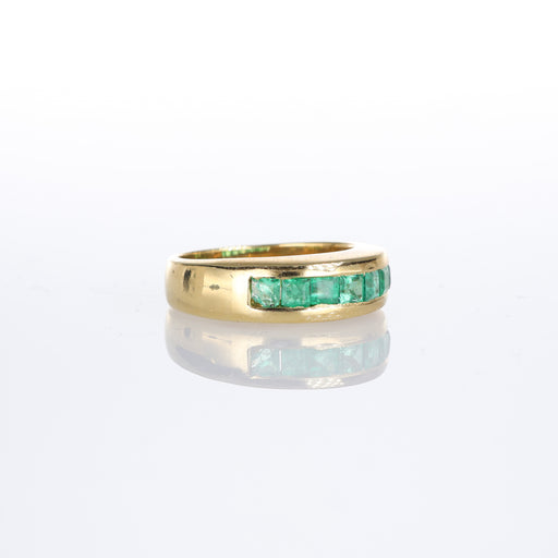 Mostra dettagli completiUn meraviglioso anello a fascia in oro giallo 18kt impreziosito da 7 smeraldi taglio carré, per un totale di 0,32 carati. Queste gemme verdi vivaci...