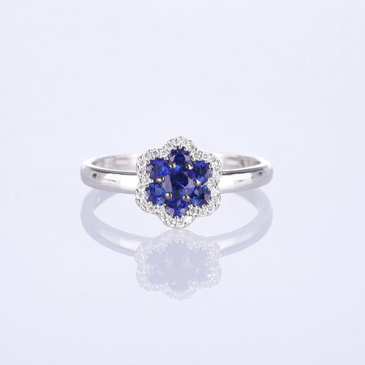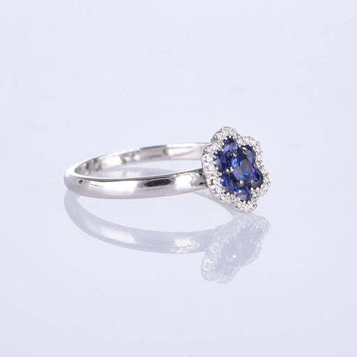 Mostra dettagli completiDelicato e affascinante anello in oro bianco 18kt dal design floreale, con un pavé di vivaci zaffiri blu naturali circondati da brillanti diamanti ...