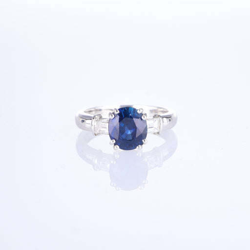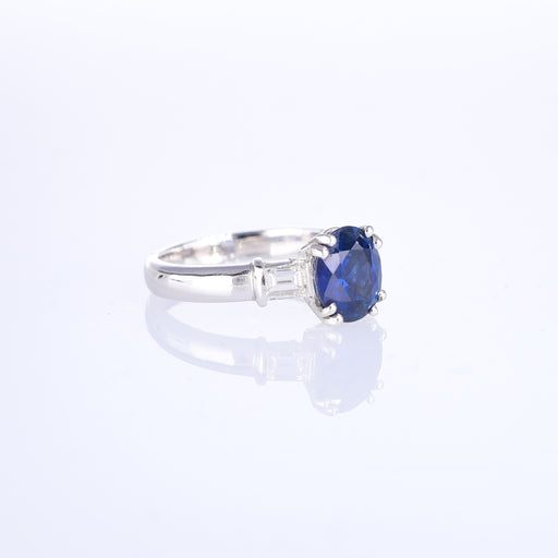 Mostra dettagli completiRaffinato anello in oro bianco 18kt con un magnifico zaffiro taglio ovale come protagonista, affiancato da due diamanti bianchi naturali taglio bag...