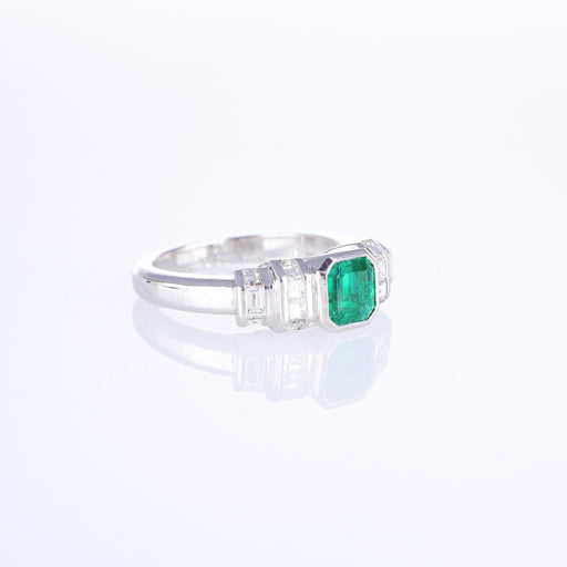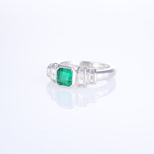 Mostra dettagli completiAnello raffinato in oro bianco 18kt con uno splendido smeraldo naturale taglio rettangolare al centro, incorniciato da due file di diamanti natural...