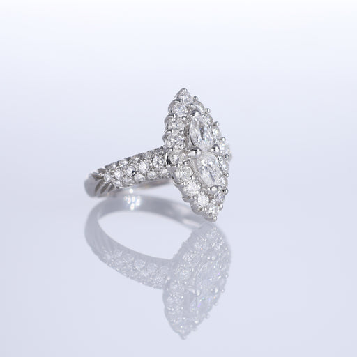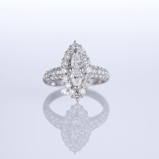 Mostra dettagli completiSofisticato anello in oro bianco 18K con due diamanti naturali taglio marquise al centro, per un totale di 0,35 carati. L’elegante incastonatura al...