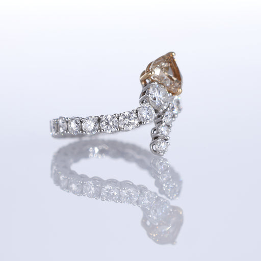 Mostra dettagli completiAudace e scultoreo, questo anello riviera "toi et moi" in oro bianco 18K presenta un affascinante contrasto tra un diamante fancy yellow taglio cu...