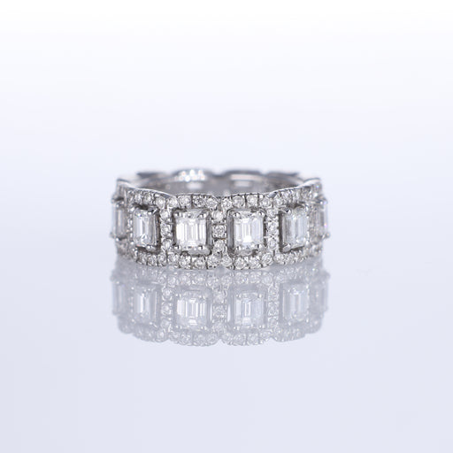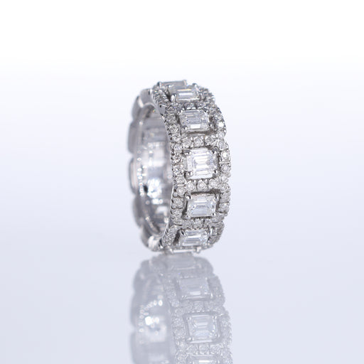 Mostra dettagli completiModerno e luminoso, questo anello eternity in oro bianco 18K presenta una fila continua di diamanti taglio baguette disposti verticalmente, incorni...