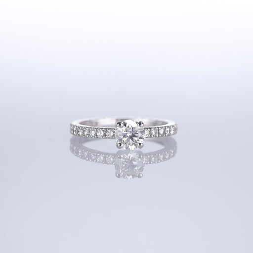 Mostra dettagli completiAnello solitario in oro bianco 18K con diamante centrale naturale taglio brillante da 0,50 carati, arricchito da un'elegante fascia con pavé di dia...
