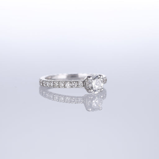 Mostra dettagli completiAnello solitario in oro bianco 18kt con diamante naturale taglio brillante da 0,70 carati al centro. La fascia è impreziosita da ulteriori diamanti...