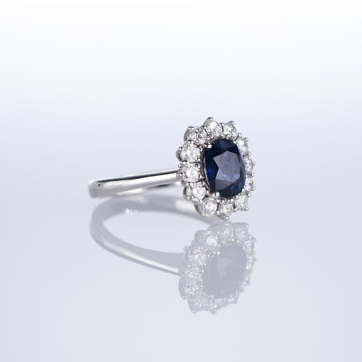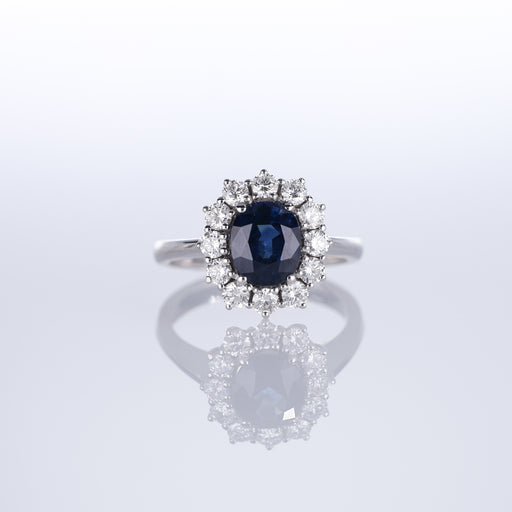 Mostra dettagli completiElegante anello in oro bianco 18kt con zaffiro naturale taglio ovale da 1,62 carati al centro, incorniciato da un raffinato halo di diamanti natura...
