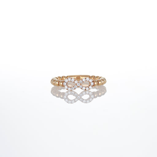 Mostra dettagli completiUn anello delicato e simbolico, realizzato in oro rosa con struttura a sferine, impreziosito da un simbolo dell’infinito tempestato di diamanti bia...