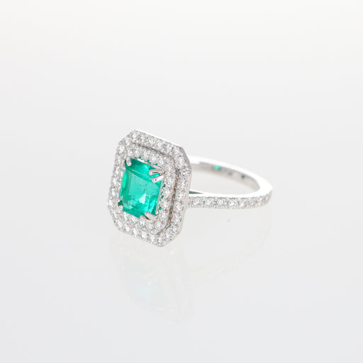 Mostra dettagli completiAnello in oro bianco 18kt con smeraldo naturale taglio ovale da 0,52 carati, incorniciato da diamanti bianchi naturali taglio brillante per un tota...