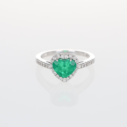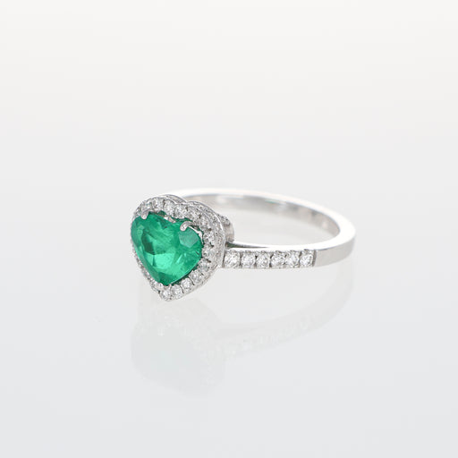 Mostra dettagli completiUn anello romantico e d’impatto, realizzato in oro bianco 18 kt con smeraldo centrale taglio cuore da 1,45 carati. La pietra, dal verde intenso e b...