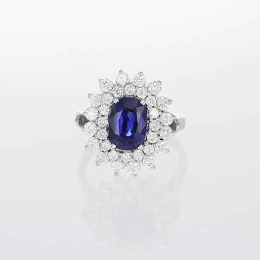 Mostra dettagli completiAnello realizzato in oro bianco 18kt con uno straordinario zaffiro naturale taglio ovale da 3,71 carati come pietra centrale. Ai lati, due diamanti...