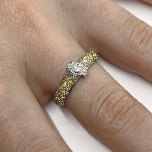Anello a fascia realizzato in oro bianco 18kt con pavé in diamanti naturali bianchi e fancy yellow per ct.4,10