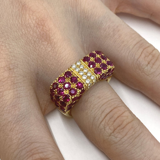 Mostra dettagli completiAnello Fiocco realizzato in oro giallo 18kt con rubini taglio brillante per ct.5.90 e diamanti bianchi naturali taglio brillante per ct.0.40