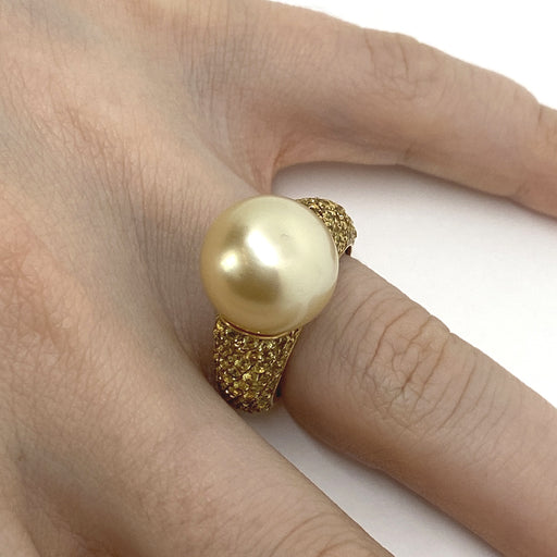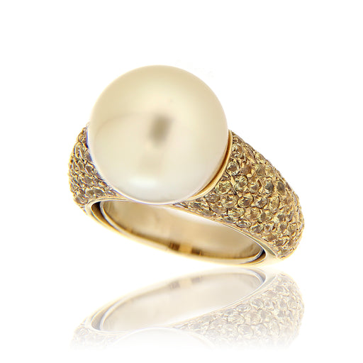 Mostra dettagli completiAnello realizzato in oro giallo 18kt con zaffiri naturali gialli taglio brillante per ct.2.59 e perla gold diametro 15.5 mm