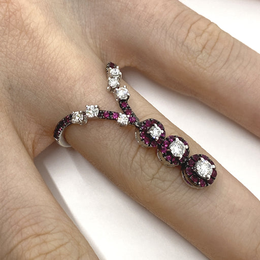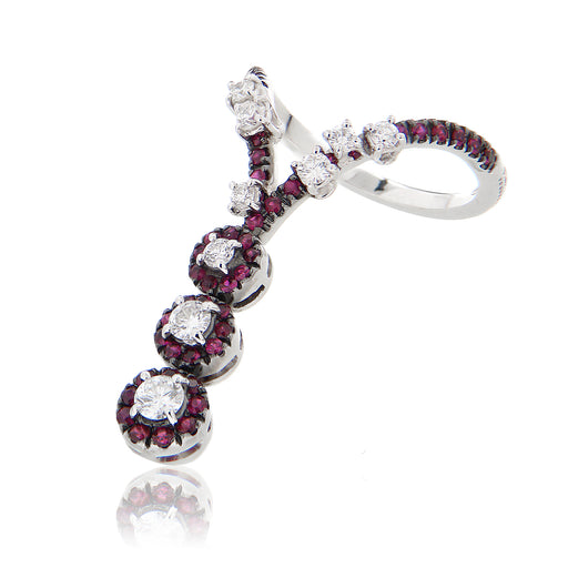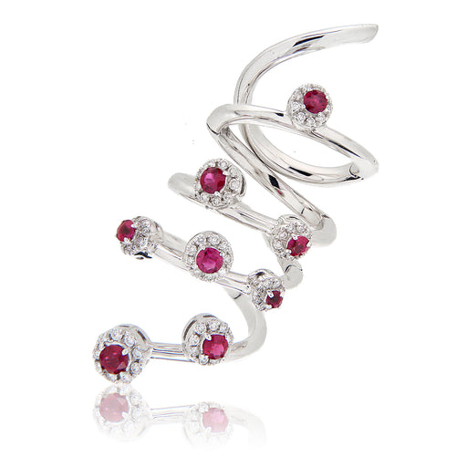 Anello modello Snake snodato realizzato in oro bianco 18kt con diamanti naturali taglio brillante per ct.0.62 e rubini naturali taglio brillante pe...