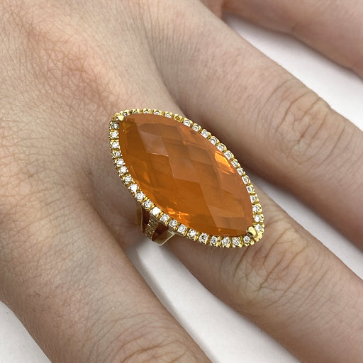 Mostra dettagli completiAnello realizzato in oro giallo 18 kt con navette centrale in quarzo citrino naturale e contorno in diamanti naturali bianchi taglio brillante per ...