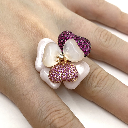 Anello tema fiore realizzato in oro rosa 18 kt .con petali in madreperla e pavé in zaffiri rosa taglio brillante per ct.0.92 e pavé in rubini per c...