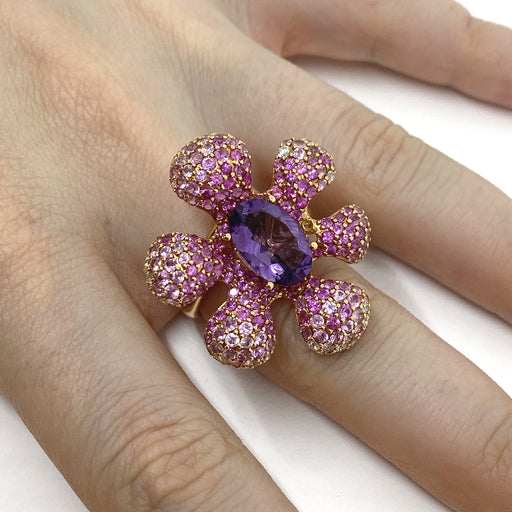 Mostra dettagli completiAnello fiore realizzato in oro rosa 18 kt con ametista per ct.3.17 e diamanti bianchi naturali taglio brillante per ct.0.64