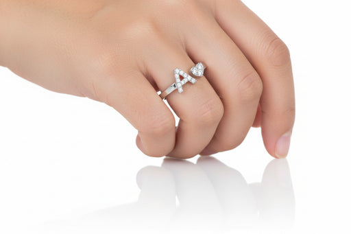 Mostra dettagli completiAnello aperto realizzato in oro bianco 18 kt, decorato da una lettera "A" e un piccolo cuore, entrambi impreziositi da diamanti naturali bianchi ta...