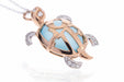 Ciondolo tema tartaruga realizzato in oro bianco e rosa 18kt con topazio azzurro e diamanti bianchi naturali taglio brillante per ct.0,19