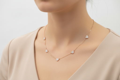 Mostra dettagli completiRomantico e luminoso, questo collier è realizzato in oro rosa 18 carati e presenta cinque elementi a forma di cuore completamente incastonati con d...