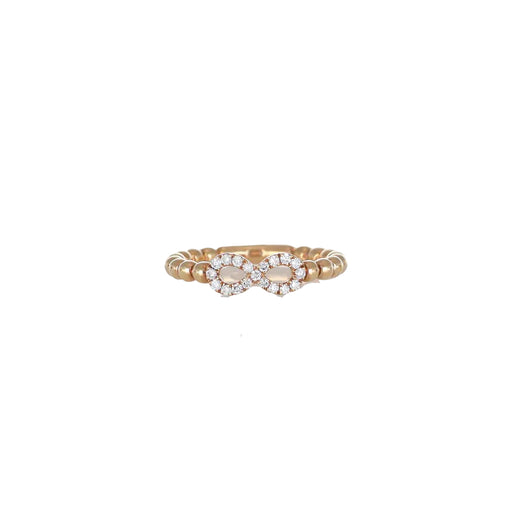 Mostra dettagli completiUn anello delicato e simbolico, realizzato in oro rosa con struttura a sferine, impreziosito da un simbolo dell’infinito tempestato di diamanti bia...