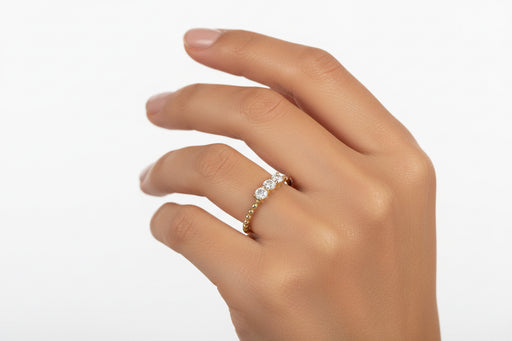 Mostra dettagli completiAnello realizzato in oro giallo 18 kt, caratterizzato da un gambo lavorato a motivi sferici e tre diamanti naturali bianchi taglio brillante, per u...