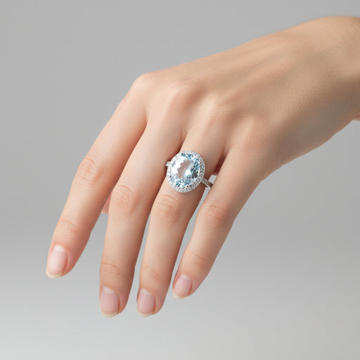 Mostra dettagli completiAnello realizzato in oro bianco 18 kt con protagonista un’acquamarina naturale taglio ovale da ct. 4,40, incorniciata da un pavé di diamanti bianch...