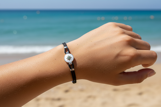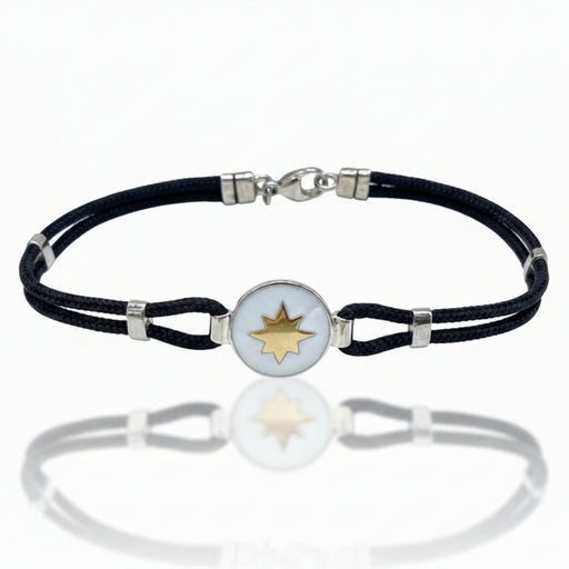 Bracciale elegante con centrale in argento e smalto bianco, impreziosito dalla rosa dei venti in oro giallo 18 kt. La chiusura moschettone in argen...