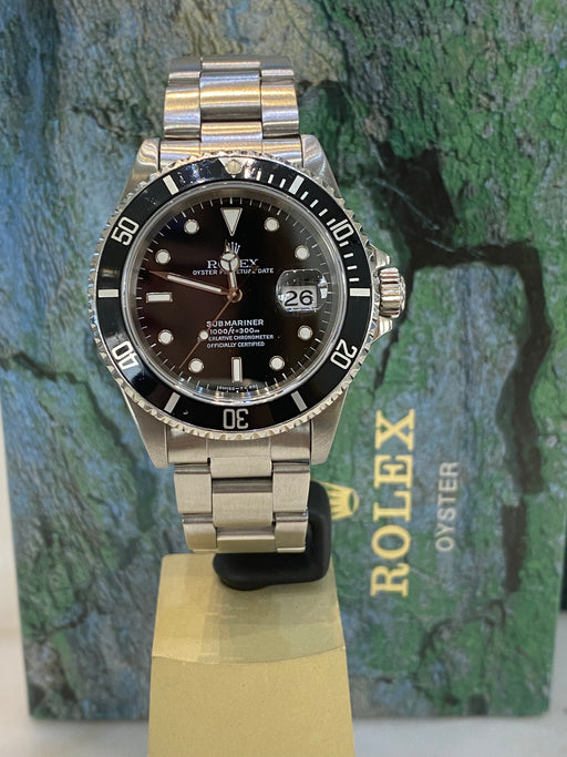 Orologio Rolex Submariner referenza 16610 in acciaio diametro 40 mm quadrante nero indici datario ore tre vetro zaffiro ghiera nera bracciale Oyste...