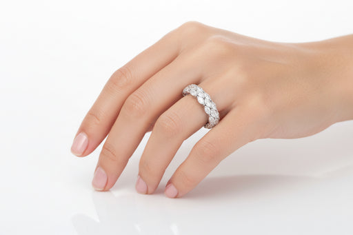 Mostra dettagli completiAnello elastico dalla linea avvolgente e sofisticata, realizzato in oro bianco 18 kt e impreziosito da diamanti naturali taglio navette per un tota...