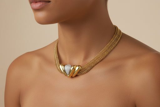 Mostra dettagli completiGirocollo semirigido in raffinata maglia a rete realizzata in oro giallo 18 kt, impreziosito da un importante elemento centrale a forma di triangol...