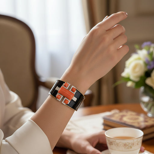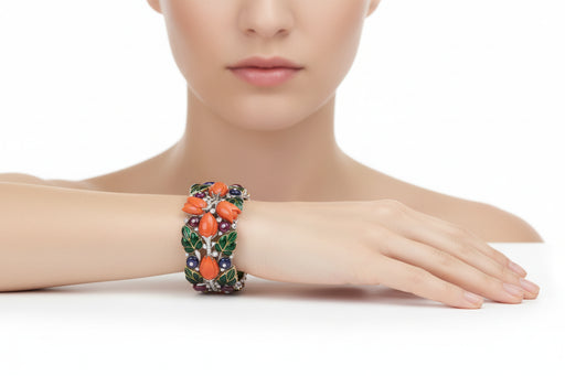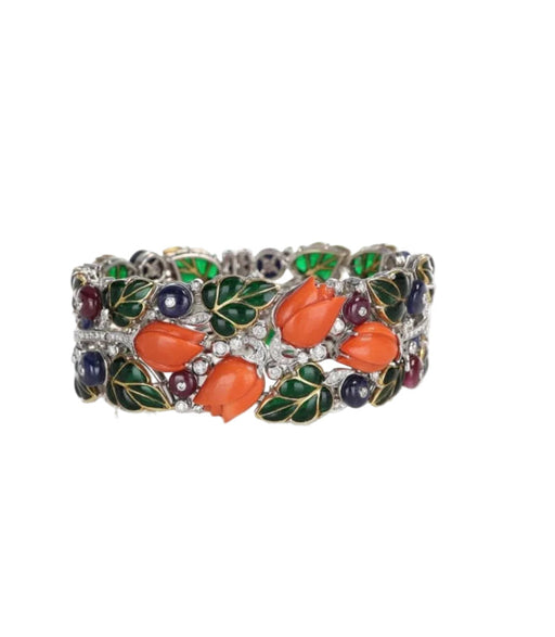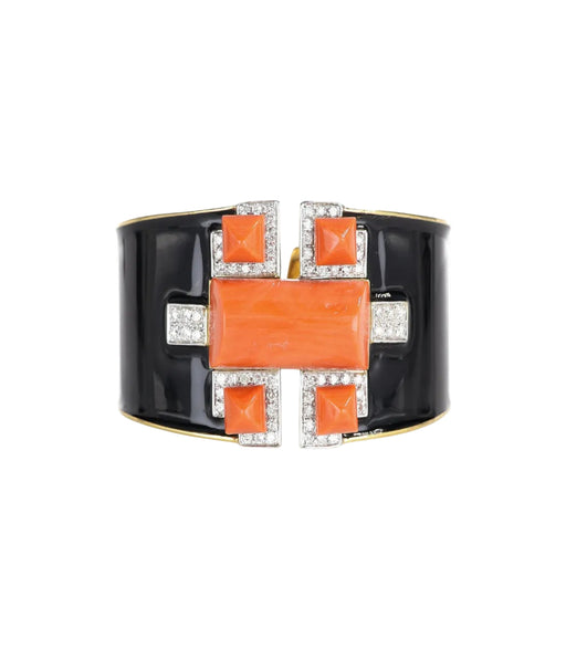 Mostra dettagli completiUn sorprendente bracciale rigido in stile Art Nouveau realizzato in oro giallo 18kt, con inserti in corallo naturale e pavé di diamanti dal tagli...