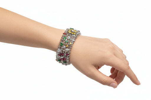 Mostra dettagli completiUn squisito bracciale semirigido in oro bianco 18kt con un delicato design a reticolo adornato da vivaci motivi a farfalla. La composizione unisce ...