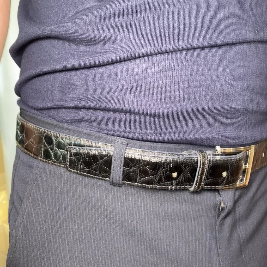Un accessorio di lusso dallo stile deciso ed essenziale, questa cintura è realizzata a mano con pelle di coccodrillo nero e impreziosita da una fibbia quadrata in oro bianco 18 kt. La lavorazione artigianale e la scelta di materiali pregiati la rendono un pezzo unico, pensato per chi desidera distinguersi con eleganza sobria e dettagli esclusivi.