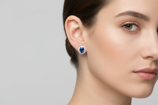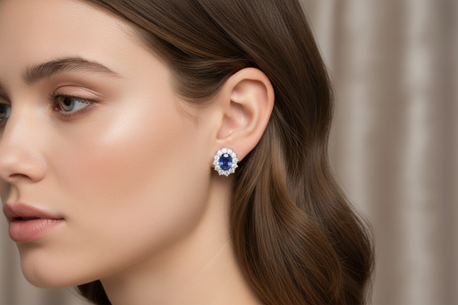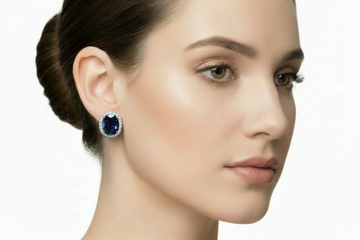 Eleganti orecchini a lobo realizzati in oro bianco 18 kt, con zaffiri naturali blu taglio ovale per un totale di 3,11 carati, incorniciati da un co...
