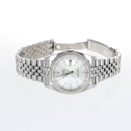 Rolex Datejust 36 mm cassa in acciaio lunetta zigrinata oro bianco 18 kt con quadrante silver indici vetro zaffiro datario ore tre bracciale jubile...
