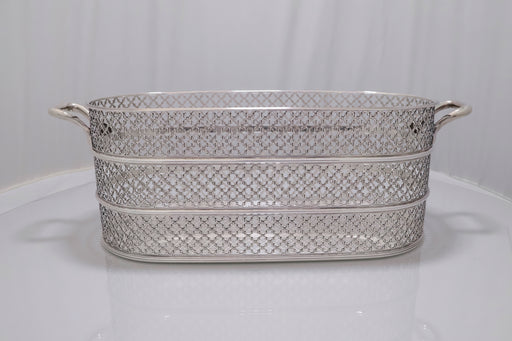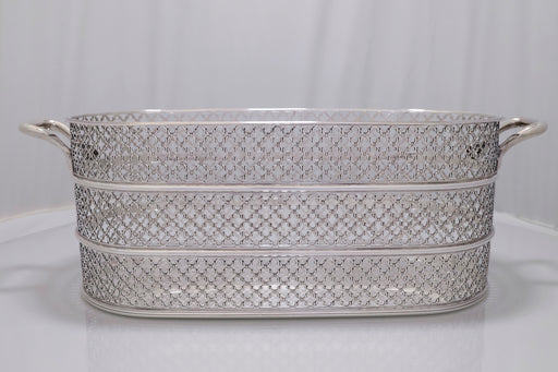 Mostra dettagli completiElegante cestino in argento 800 dallo stile raffinato, con traforatura a motivi geometrici e struttura a tre fasce. I manici laterali completano la...