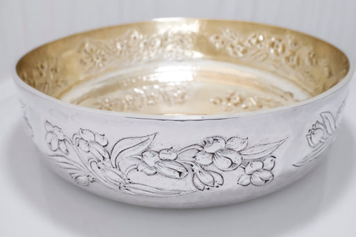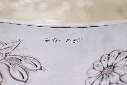 Elegante centro tavola realizzato in argento con interno finemente dorato e bordo esterno decorato a sbalzo con motivi floreali. L’armoniosa...