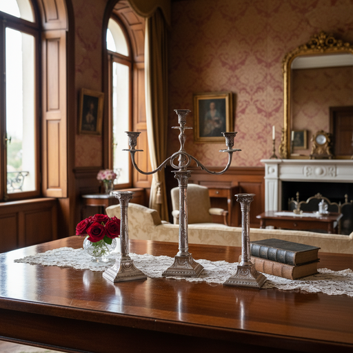 Coppia Candelieri a tre Fiamme in Sheffield con base quadrata con disegni liberty e fiocchi a sbalzo ,epoca Londra 1890 Cm.43x30
