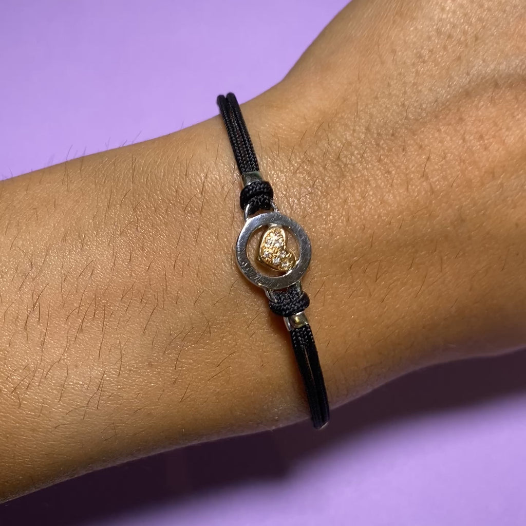 Bracciale con cordino nero e chiusura a moschettone, arricchito da un elemento centrale in oro giallo e bianco con piccolo cuore impreziosito da diamanti naturali taglio brillante per un totale di ct. 0,03. Un gioiello leggero e raffinato, ideale da indossare ogni giorno o da regalare come simbolo affettuoso.