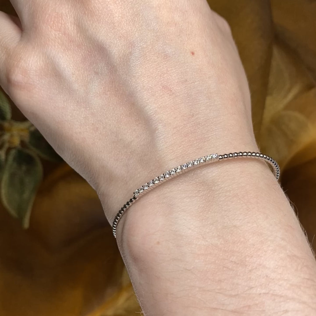 Bracciale rigido dal design moderno ed essenziale, realizzato in oro bianco 18 kt e impreziosito da una barretta centrale con diamanti naturali bianchi taglio brillante per un totale di 0,33 carati. La chiusura magnetica integrata garantisce praticità e comfort, senza rinunciare all’eleganza. Un gioiello luminoso e versatile, perfetto per essere indossato tutti i giorni.